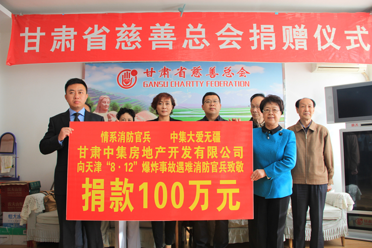 2015年9月17日上午,甘肅中集房地產(chǎn)開發(fā)有限公司總經(jīng)理周啟濤親自前往甘肅省慈善總會,將100萬元善款交給甘肅省慈善總會,委托甘肅省慈善總會轉(zhuǎn)交給天津市慈善協(xié)會,并由天津市慈善協(xié)會將善款交由天津市消防部門發(fā)放至參加天津港“