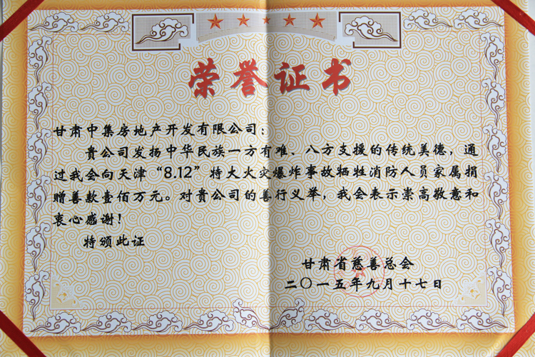 2015年8月12日23時30分,天津濱海新區(qū)國際物流中心發(fā)生重大爆炸火災(zāi)事故,造成重大人員傷亡。甘肅中集房地產(chǎn)開發(fā)有限公司總經(jīng)理周啟濤獲悉后,決定為在本次事故中犧牲的消防官兵及其家屬捐款100萬元,用于幫助犧牲消防官兵家屬善后事宜的處理,以盡一份甘肅企業(yè)的慈善愛心。