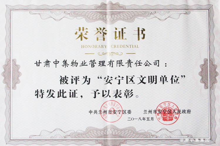 甘肅中集物業(yè)管理有限責(zé)任公司被蘭州市安寧區(qū)委、安寧區(qū)人民政府聯(lián)合授予“文明單位”..
